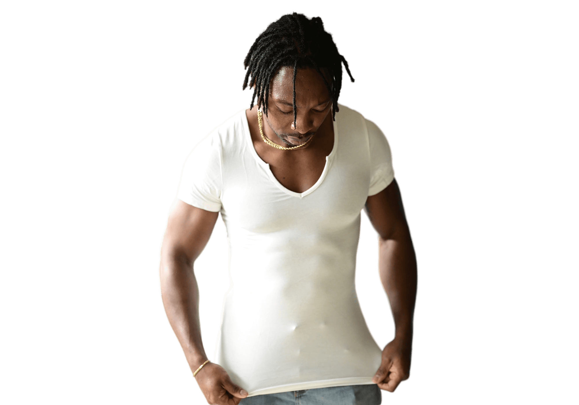 Recent male fashion trends have men wearing more form-fitting and chest-exposing tops. The problem with traditional tank top undershirts, (also known as Athletic shirts or A-shirts), is that they are usually visible when wearing a lowcut or button-down shirt over the tank, which detracts from the overall look. So I needed an option that offers the sophistication of the v-neck T-shirt, without the constraint or gathering of the sleeves. Combining the lightness and breathability of the tank top/undershirt creates the perfect union of simplicity, sleekness, and versatility.